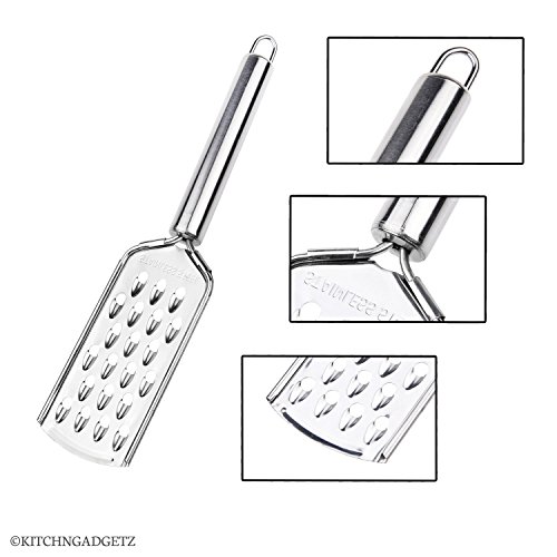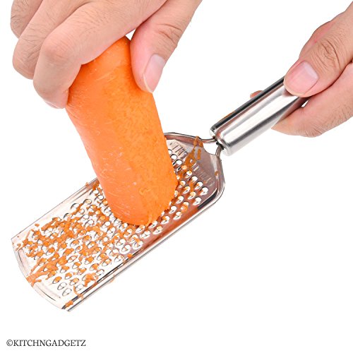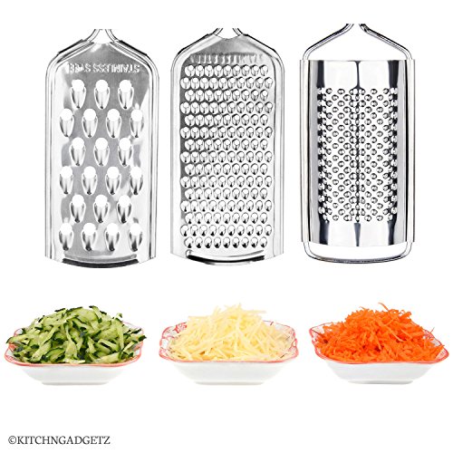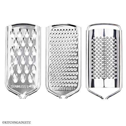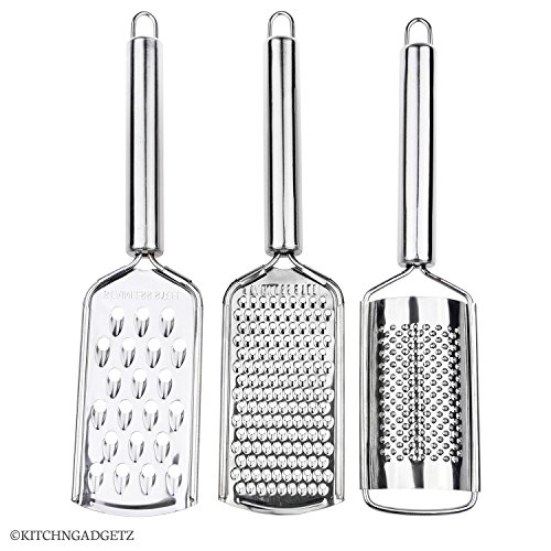 Studio : Kitchen Supplies Publisher : Kitchen Supplies Product Description Kitchen Graters (3-Pack) Set of 3 handheld stainless steel kitchen graters. 2 with flat 'paddle' design and 1 with rounded design. 3 different grate sizes (small, medium, large). Perfect for fresh home cooking use. Grate cheese and vegetables for salad, pasta or pizza toppings. Shave fruit and chocolate to decorate cakes. Robust construction with durable, razor sharp teeth for high performance and quick results. Made of rust-free stainless steel. The large handle grip offers a firm grip, for comfortable grating. Easy to clean and dishwasher safe. However, please pay attention when washing the grates by hand. We recommend wearing cut-resistant gloves. A must-have kitchen essential for every home cooking enthusiast. Also great as gift. Contents: - 3x Kitchen Graters 0