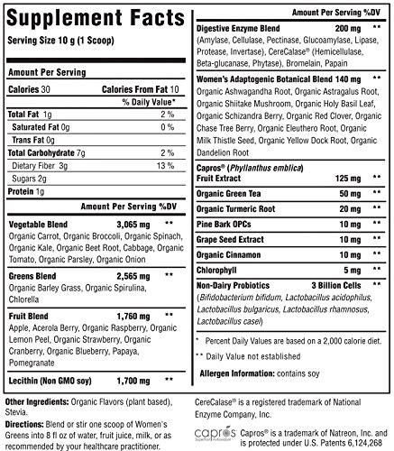 MADE WITH YOU IN MIND: This version of our Renewal Greens blend is made with gender specific herbs shown to be beneficial for women. This organic blend of vegetables, greens, and fruit also contains a complete digestive enzyme and non-dairy probiotic blend to support optimal intestinal health. Also included is an adaptogenic botanical blend to support optimal health for women.