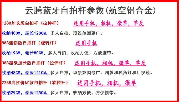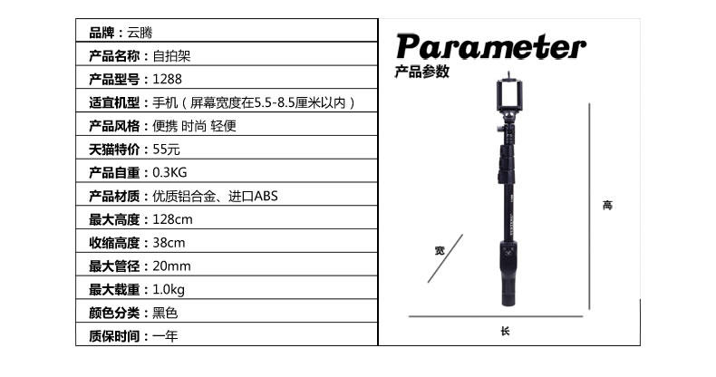 云腾蓝牙自拍杆参数(航空铝合金)