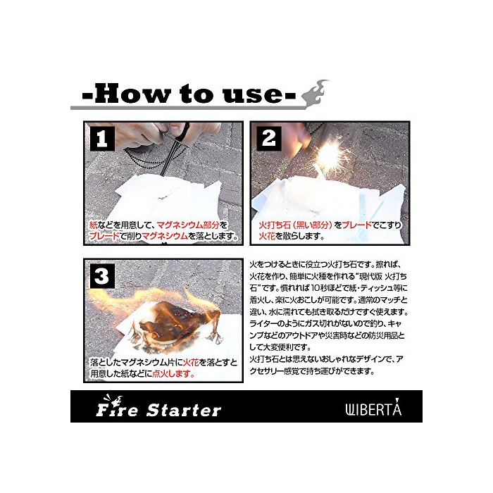 【사용 방법】①지등을 준비해 마그네슘 부분을 블레이드로 깎아 마그네슘을 떨어뜨립니다.②화타돌(검은 부분)를 블레이드로 넘는(거르는) # 불꽃을 어지릅니다.③떨어뜨린 마그네슘편에 불꽃을 떨어뜨리면 준비했 지등에 점화 합니다.