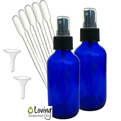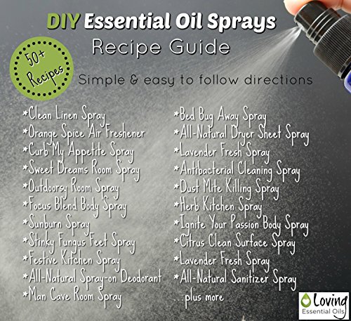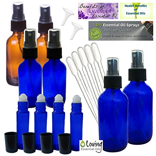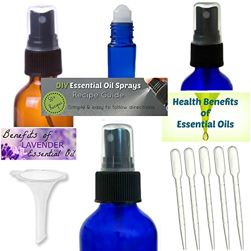 -. Feature : MUST HAVE SUPPLIES: 4 oz Blue Spray Bottles, 2 oz Blue and Amber Sprayers, Cobalt Blue Roll on Containers, Funnels, Pipettes, Benefits of Essential Oils, Lavender Guide, Over 50 EO Spray Recipes. / IMPROVE YOUR LIFE: 20 PC kit can help you achieve a happier and healthier life with essential oils. Has valuable reference material on Health Benefits of Essential Oils, Lavender EO & Spray Recipes. / MAKE IT HOMEMADE: Create Aromatherapy Blends, Beauty Products, DIY Cleaning, Air Fresheners, Natural Skin Care, Room Sprays, Home Remedies, Lip Gloss, Pillow Mist, Body Spray Atomizer. / BONUS RECIPE GUIDE: Ready to make some Essential Oil Sprays. Over 50 Recipes included in our bonus guide. Making oils a part of everyday life is easy with these misting spray bottle recipes. / USE WITH ANY OIL BRAND: Whether you use Doterra, Young Living, Mountain Rose Herbs, Aura Cacia, Wyndmere, Now Foods, Edens Garden, Plant Therapy or any other brand, these sprayers are for you.
