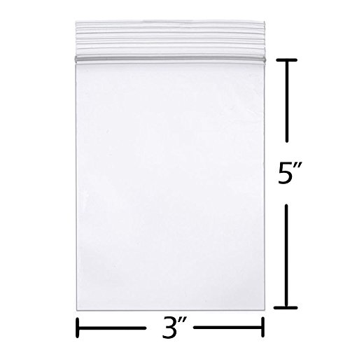 - 3"W x 5"H (below the zipper), plastic, clear, 2 mil, pack of 100