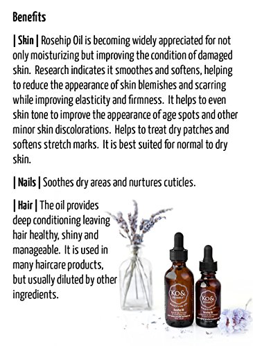-. Binding : Misc. -. Brand : Ko & Humble Beautifying Oils -. EAN : 0019962366451 -. Feature : Anti-aging corrective treatment oil | for normal to dry skin | Sourced from Germany, incredible quality / Improves flexibility and elasticity; Promotes skin health / Corrective properties for damaged skin, high in essential fatty acids / Moisturizing and soothing, natural salty/nutty aroma as oil is in a pure state / Improves appearance of fine lines, evens skin tone and treats minor skin discolorations -. Label : Kate & Michael Beauty Co. -. Manufacturer : Kate & Michael Beauty Co. -. Model : Organic Rosehip Oil -. ProductGroup : Beauty -. ProductTypeName : BEAUTY -. Publisher : Kate & Michael Beauty Co. -. Size : 1 Oz. -. Studio : Kate & Michael Beauty Co. -. Title : Rosehip Oil, Organic, from Ko & Humble Beautifying Oils, Cold-Pressed in an Amber Glass Bottle with Dropper, Ethically Sourced, Certified Cruelty-Free, 30 ml, 1 Oz -. UPC : 019962366451