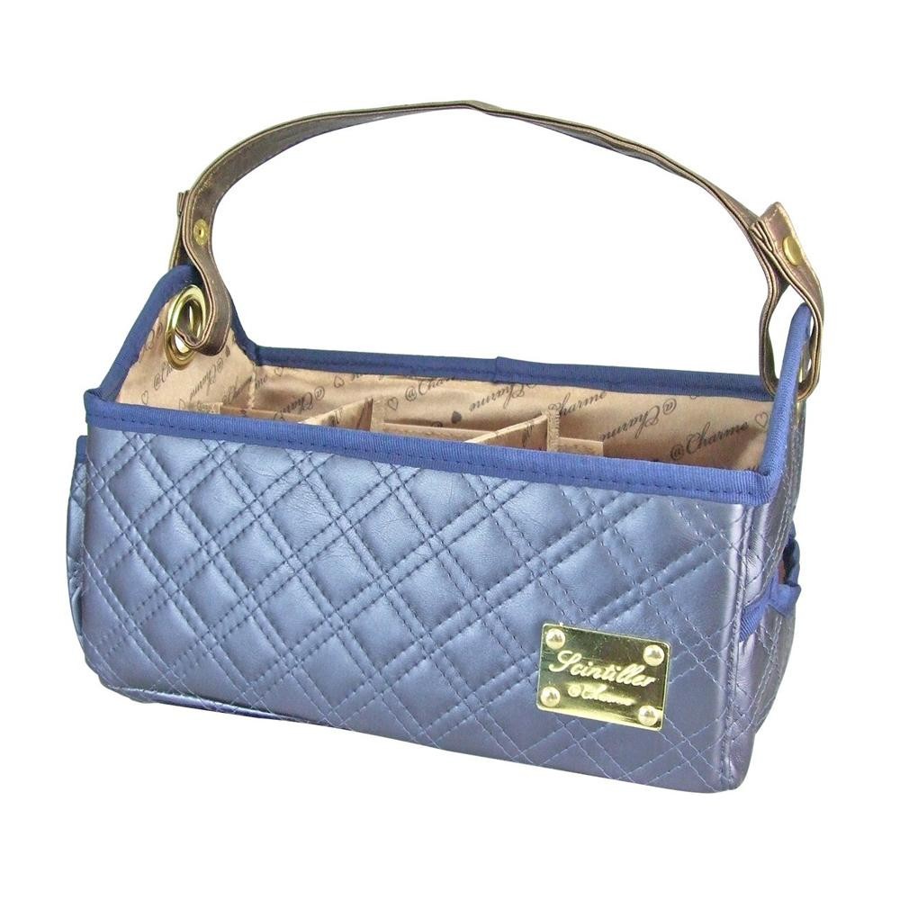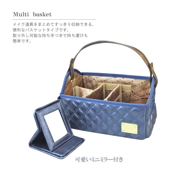 メイク道具をスッキリ収納できるバスケットタイプ。持ち手は取り外し可能です。内側を4つに仕切れる中仕切り2枚付き。 |