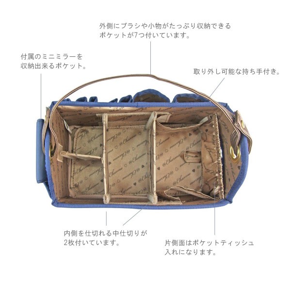 | 仕様 | 持ち手:取り外し可能 仕切り:内側を4つに仕切る中仕切り2枚 外ポケット:7個 内側:ギャザーポケット |