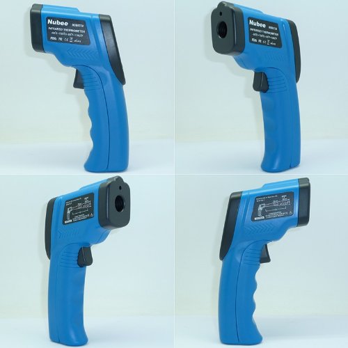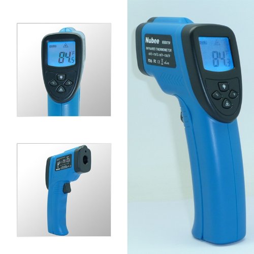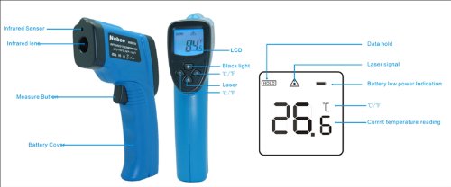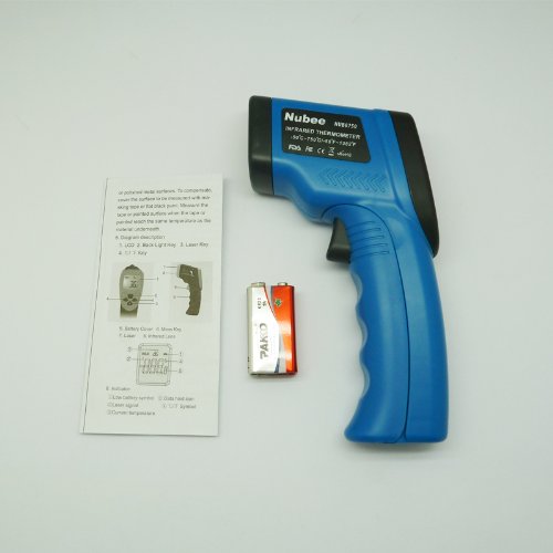Studio : Nubee Publisher : Nubee Binding : Automotive Product Description Take accurate temperature readings with this laser-sighted infrared Gun thermometer. Reads in Celsius or Fahrenheit, there is a switch on the pannel to choose between them. There's also a switch to turn on or off the laser sight. Nubee® temperature gun measure below-zero and super-hot temperatures. Whether you want to measure something cold or very hot, this thermometer has it handled. Able to measure temperatures from -58 to 1382°F (-50 to 750°C), you can check nearly any temperature you'd find in your household quickly. Designed for ease of use, the thermometer features auto shutoff and a low battery indicator to let you know when it's time to replace the standard 9V battery.