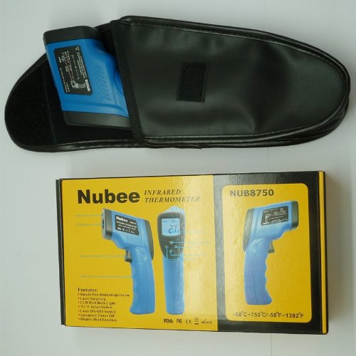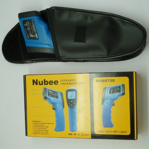 Package Includes: 1 x Nubee® NUB8750 Temperature Gun Non-contact Infrared Thermometer 1 x 9V DC battery 1 x Padded, protective carrying case with belt loop 1 x Nubee® NUB8750 Temperature Gun User's manual