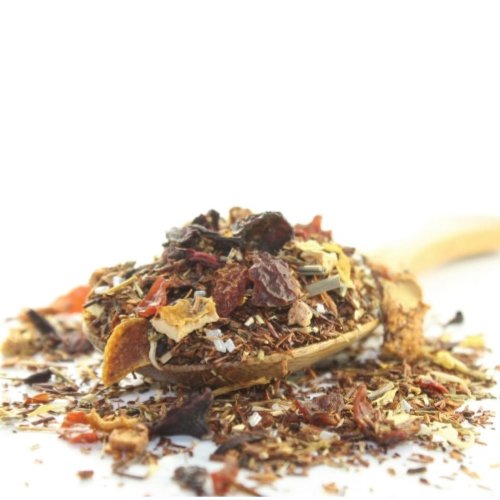 -. Feature : Caffeine-free, healthy tea; high in antioxidants / Ingredients: Rooibos, honeybush, lemongrass, citrus bits, calendula flowers and flavoring.