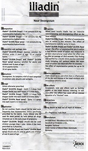 Studio : Under License of Merck KGaA, Darmstadt, Germany Publisher : Under License of Merck KGaA, Darmstadt, Germany Binding : Health and Beauty Product Description COMPOSITION: Each 1 mL of the solution contains: 0.25 mg Oxymetazoline Hydrochloride PHARMACOLOGICAL ACTION: ILIADIN Pediatric 0,025% is a topical vasoconstrictor which exerts a decongestant action on mucous membranes of the nasopharyngeal cavity. INDICATIONS: ILIADIN Pediatric 0,025% is indicated for Temporary relief of nasal congestion in common cold, sinusitis and Syringitis. CONTRA-INDICATIONS: Hypersensitivity to any of the ingredients. DOSAGE AND DIRECTION FOR USE: ILIADIN Pediatric 0.025% Drops are indicated for children up to the age of six years. Drops: Fill glass dropper unit by placing the open end into the liquid and depressing the rubber teat. Tilt the head back and instil 1 - 2 drops of the liquid in each nostril two to three times a day. SIDE-EFFECTS AND SPECIAL PRECAUTIONS: ILIADIN should be used with care in patients with cardiac disease, hypertension or hyperthyroidism. It may cause local stinging or burning, sneezing and dryness of the mouth and throat. Prolonged use may cause rebound congestion and drug-induced rhinitis. Iliadin should not be used for a period longer than five days. It is not advisable to use Iliadin more frequently than recommended. If unexpected side-effects appear, consult your doctor immediately. PACKAGE SIZE: Iliadin (0.025% Drops) aqueous Solution for Children Under 6 Years of Age: 10 mL dropper Pipette bottle. STORAGE INSTRUCTIONS: Keep our of reach of children. Store below 25°C. Protect from light. 0