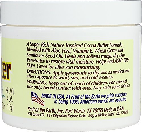 Studio : Fruit of the Earth Publisher : Fruit of the Earth Binding : Health and Beauty Product Description Fruit of the Earth cocoa butter with aloe vitamin e skin care cream is a super rich nature inspired cocoa butter formula blended with aloe vera, vitamin e, wheat germ and sunflower seed oil. It heals and softens rough, dry skin. And penetrates to restore vital moisture. Fruit of the Earth cocoa butter with aloe vitamin e skin care cream helps end ashy dry skin and itrsquos great for after-sun moisturizing. 0