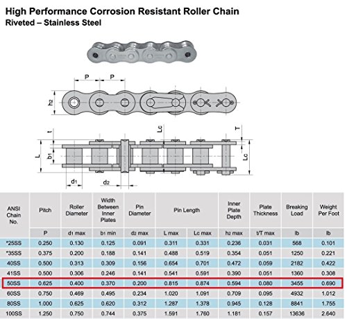 Donghua® #50 SS Stainless Steel Roller Chain, 10FT With 1 Connecting Link, Single Strand, Corrosion Resistant Material, Durable In Harsh Elements