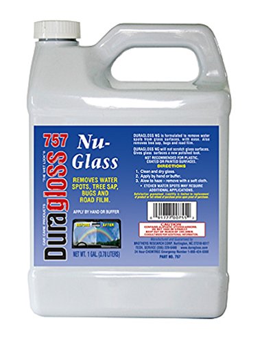 Duragloss nu-glass is a blend of cleaners and selected abrasives formulated to remove water spots from glass surfaces without scratching. Duragloss nu-glass can be applied by hand or mechanical buffer. Many drivers are afraid to polish their vehicle's windshields for fear of scratching it. Duragloss nu-glass is a safe way to polish glass without scratching, distorting or damaging the glass. This gentle cleaner removes what is on the glass without harming the glass itself. Before your reach for steel wool or some harsh solvent, try Duragloss nu-glass. It safely removes water spots, tree sap, bugs and stubborn road film using a combination of cleaners and abrasives. The abrasives smooth the outermost glass by polishing away rough water spots and dislodging stubborn bugs and sap. The cleaners remove films and dirt that cloud your visibility. Duragloss nu-glass contains lubricants to protect the glass from abrasion. Apply it by hand or with a buffer to easily remove imperfections and improve the clarity of automotive glass. If you don't have a buffer, a great alternative is the spot buffs kit, which includes 4 inch pads and a backing plate for use on an electric drill, not included. Use the white polishing pad on glass. It enhances the smoothing ability of the polish but it will not scratch the glass. If applying by hand, use a polyfoam applicator. Once you've polished your vehicle's glass, use Duragloss rain repel 751, not included, to seal and protect the glass. Remove water spots, tree sap, bugs and road film without scratching. Duragloss nu-glass is a safe, practical glass polish that really works.