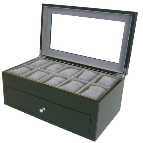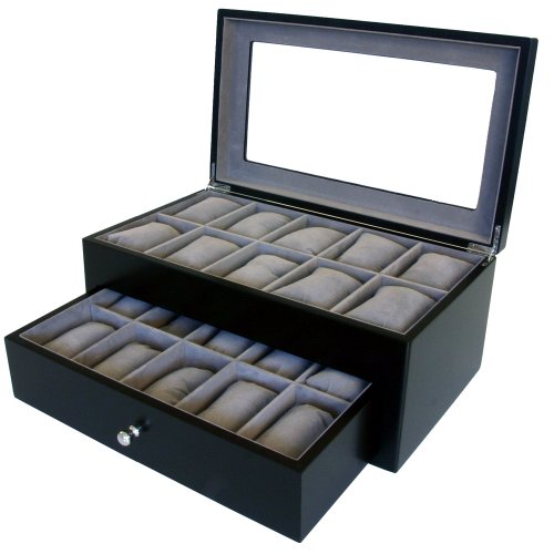 Studio : Paylak Inc Publisher : Paylak Inc Binding : Watch Product Description Montego Watch Box is our newest collection of wood boxes by Tech Swiss. Showcase your timepieces in this matte black finish Montego box for 20 watches. The Montego box is a well-designed box with XL wide compartments to hold large watches, soft cushions to fit both men and ladies watches and extra clearance for oversized timepieces. The meticulous made watch box comes with two levels with 10 compartments on the upper shelf and a lower drawer that pulls out for additional 10 watches. The interior is lined with a charcoal grey colored faux suede lining and each compartment comes with a soft removable cushion. The lid is inlaid with a Lucite window and is attached by two silvertone hinges. This attractive looking chest is a efficient way to store your most valuable timepieces. Watch box can be placed on a desk, night stand or dresser. Case Dimensions: 14 1/2" L x 8 1/2" W x 6" H Upper Compartment Size: 3 3/4" L x 2 1/2" W x 2 3/4H Lower Compartment Size: 3 3/4L x 2 1/4W x 2 1/4H 0