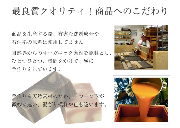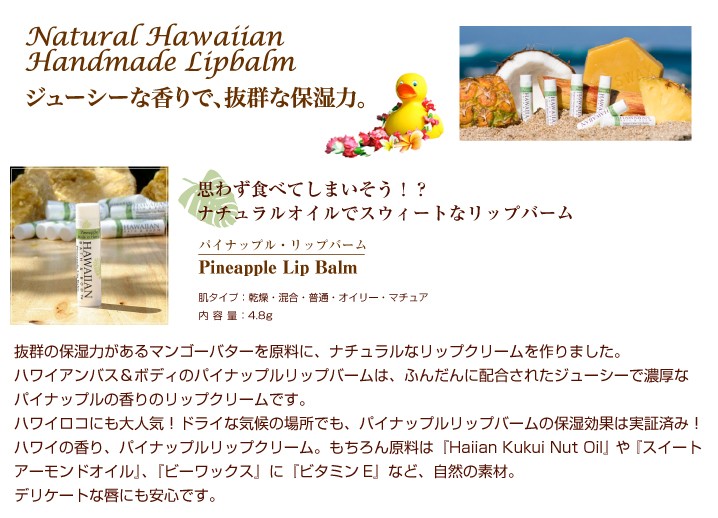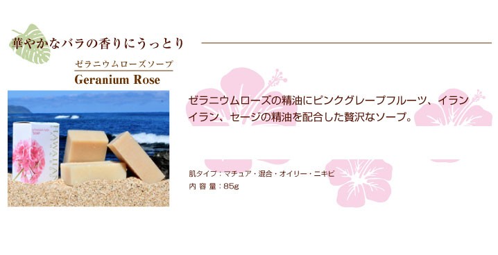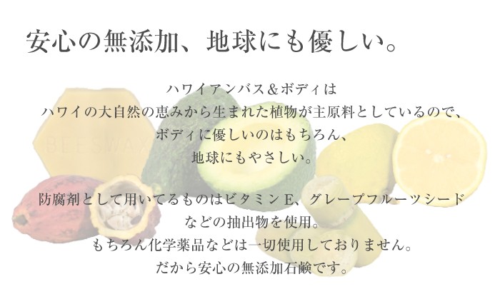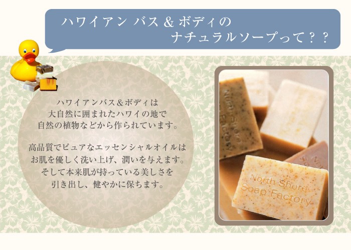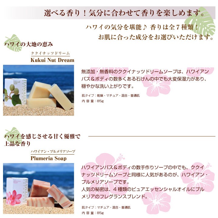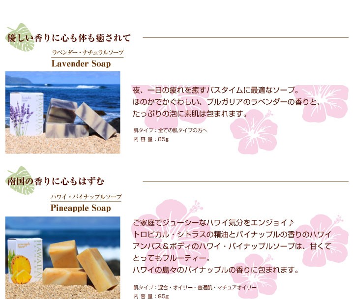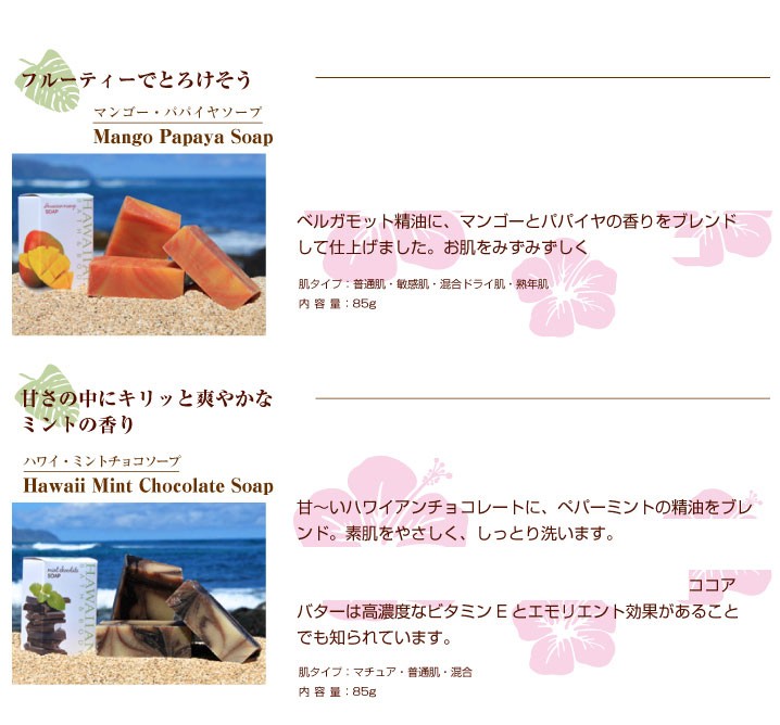 | 原材料 | 【ククイナッツドリーム】 水、ヤシ油、パーム油、ダイズ油、水酸化Na、オリーブ油、カラスムギ殻粒、ククイナッツ油、コーンスターチ 【ハワイアン・プルメリアソープ】 水、ヤシ油、パーム油、ダイズ油、水酸化Na、オリーブ油、カラスムギ穀粒、コメヌカ、コーンスターチ、マカデミアナッツ油、香料、ククイナッツ油、コメヌカ油、ニオイテンジクアオイ花油、レモン果皮油、イランイラン花油、ローズウッド木油、カオリン 【ハワイアン・マンゴーソープ】 水、ヤシ油、パーム油、ダイズ油、水酸化Na、オリーブ油、コメヌカ、コーンスターチ、香料、マカデミアナッツ油、ククイナッツ油、ベルガモット果実油、ローマカミツレ花エキス、トウキンセンカ花エキス、ウコン根、水溶性アナトー、酸化鉄、パパイヤ葉エキス 【ラベンダー・ナチュラルソープ】 水、ヤシ油、パーム油、ダイズ油、水酸化Na、オリーブ油、カラスムギ殻粒、ラベンダー油、マカデミアナッツ油、ククイナッツ油、アルカナ根エキス、グレープフルーツ果皮油、ローズウッド木油、カオリン、マンダリンオレンジ果皮【ハワイ・パイナップルソープ】水、ヤシ油、パーム油、ダイズ油、水酸化Na、オリーブ油、カラスムギ殻粒、コメヌカ、コーンスターチ、マカデミアナッツ油、香料、マンダリンオレンジ果皮、ククイナッツ油、オレンジ果皮油、グレープフルーツ果皮油、酸化鉄 【ゼラニウムローズソープ】 水、ヤシ油、パーム油、ダイズ油、水酸化Na,オリーブ油、カラスムギ殻粒、マカデミアナッツ油、ニオイテンジクアオイ花油、ククイナッツ油、ドイツアヤメ根エキス、イランイラン花油、オニサルビア油、グレープフルーツ果皮油 【ハワイ・ミントチョコソープ】 水、ヤシ油、パーム油、ダイズ油、水酸化Na、オリーブ油、コメヌカ、コーンスターチ、セイヨウハッカ油、マカデミアナッツ油、ククイナッツ油、カラスムギ殻粒、カカオ果実、クログルミ殻エキス、カカオ葉細胞エキス、カカオ脂、モンモリロナイト、ベンゾインガム 【パイナップルリップバーム】 マンゴー種子脂、ミツロウ、ヤシ油、アーモンド油、マカデミアナッツ油、ククイナッツ油、トコフェロール、オレンジ果皮油、香料、ローズマリー葉エキス |
