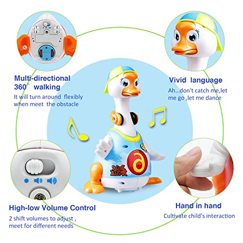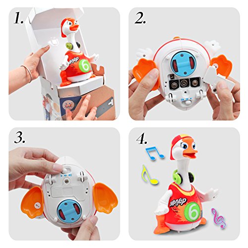 -. Feature : Best Choice Products is proud to present this new amusing toy duck to observe and explore various functions of this toy. / Vibrant Colors, songs, and dancing all preinstalled??incorporates 3hip-hop songs with distinct rhythms, Express your love with this musical yellow flapping duck. Make play time a fun time! / The duck sings fun and happy tunes while flapping and lighting up its wings. the child will enjoy dancing and moving with the universal moving function installed in the duck. / Bump and Go Action, Wings flap and light up when music begins, Lights, Music, and Talks (Adjustable Volume), Buttons on duck imitate duck sound and sing a tune when pushed / A button with a picture of 2 stars-makes three different sounds. A button with a picture of a duck and a musical note - plays 2 different songs. A button with a picture of a star and musical notes- plays many different tunes. A button with a picture of a duck's face - when pushed says "uh oh". The red heart button makes a sound of a beating heart. The little duck button on its belly says "quack quack"As A Birthday Gift, Holiday Gift Or Just As A New Gift