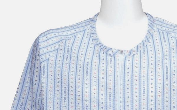 胸元にホックのないスマートなデザイン。右足首から胸元のファスナーと、股部分のファスナーで、着替えや介護が楽にできます。前身ごろ、股下がめくれます。