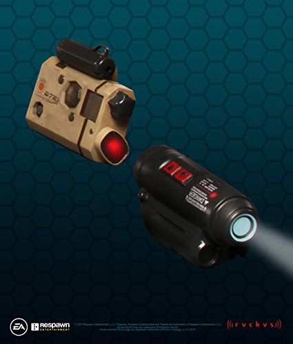 Titanfall 2 Vanguard Pilot Helmet Replica: The iconic Titanfall Pilot helmet has been brought to life in this 1:1 full scale replica. Featuring mixed material elements, the helmet includes a battery operated blue light-up translucent faceplate, blue status/task light, functional tactical ARC rail system/an adjustable interior head strap and display stand. Tactical Helmet Accessories: A tactical spotlight and targeting laser sight. These two battery operated helmet accessories are designed to be mounted on the ARC rail system of the helmet. Independently operated, the functional mounted spotlight will light up the night and the simulated laser sight features a super-bright non-projected red LED.