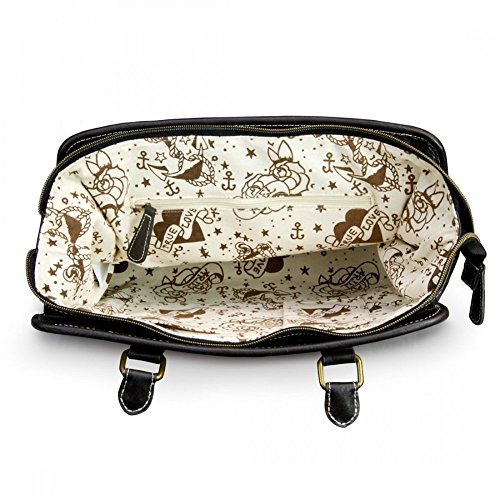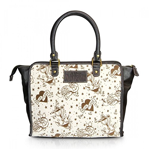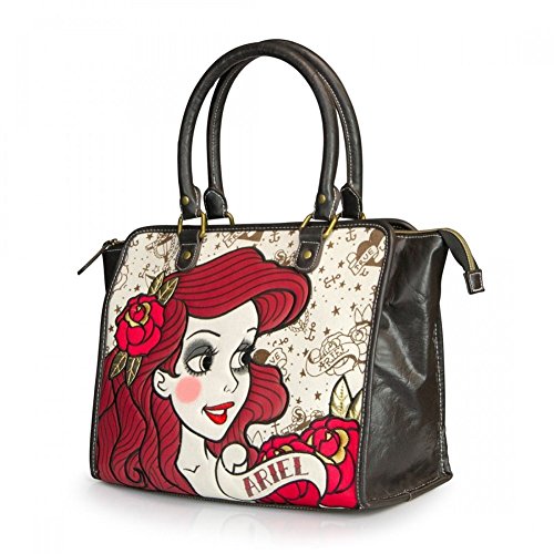 Ariel splashes out of the sea and onto Loungefly's cool new vintage tattoo inspired tote bag! The printed canvas and faux leather tote has embroidered and printed faux leather applique. Double straps. Includes a removable and adjustable length shoulder strap that extends to 50 inches. Interior is fully lined with Ariel tattoo themed canvas material. Interior features one large zippered side pocket and two open side pockets. Measures 13 x 11 x 5.5 inches. 6.5 inch strap drop. Vegan friendly and absolutely gorgeous!Feature