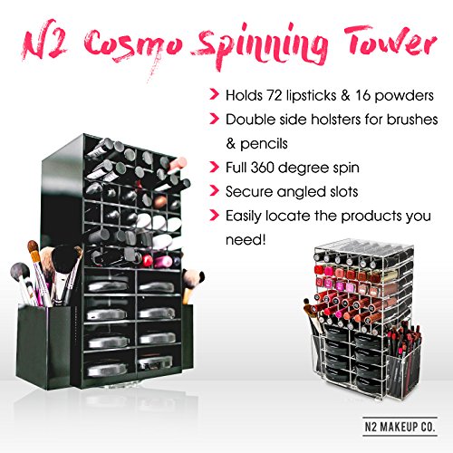 SPINS 360 Degrees! Simple access with double sided acrylic slots for powder, lipstick and lip gloss. 2 compartments on the sides for cosmetic brushes and lip liner pencils!