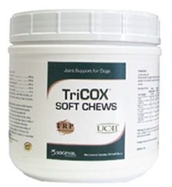TriCOX Soft Chews are a complete joint support supplement for dogs. Tricox features a unique blend of ingredients, including UCII, astraxanthin, glucosamine, MSM and creatine. These soft chews are highly palatable, using TRP technology and an irresistible liver flavor. Recent findings have shown that the primary occurrence and progression of osteoarthritis in dogs is an abnormal response of the immune system to exposed cartilage proteins. TriCOX helps combat this by desensitizing the immune system and preventing proinflammatory immune attacks on joints through a patented form of undentured collagen called UCII. In recent scientifically objective GFP and clinical studies, UCII was shown to: Decrease lameness by 78 Decrease overall pain by 62 Decrease painful limb movement by 91 Increase peak force by 18 Increase impulse area by 44 Boswellia extract further assists in maintaining normal inflammatory response. TriCOX also contains Astaxanthin, which is a powerful antioxidant that has been proven to be 6,000 times more potent than vitamin C. TriCOX's comprehensive joint support includes the cartilage building blocks glucosamine and MSM, and muscle support with creatine. TriCOX is formulated using the TRP Soft Chew technology, giving the product unparalleled softness and palatability. TriCOX is highly recommended for elderly dogs, active and working dogs, dogs with joint stiffness and discomfort, or dogs that may have difficulty rising, jumping or taking stairs.