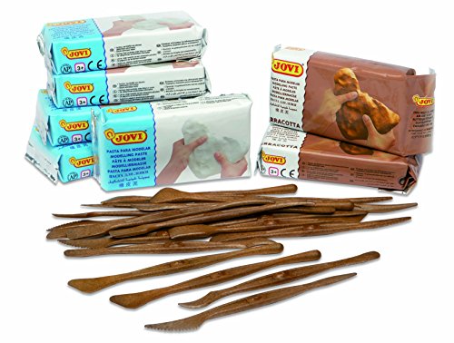 Class Pack includes 5 white and 2 terracotta 1.1 lb. packages of Jovi Air-Dry Clay and 20 modeling tools (4ea of 5 styles) in an air-sealed tote.