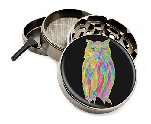 Rainbow Owl Herb Grinder 4 Piece Zinc Gun Metal Premium Quality Grinders 2.5" Wide Large Size Owls Painting Original Art Pastel Pastels