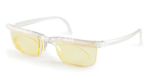 Adlens Interface Computer Eyewear. Stop digital eye strain in its tracks. -6 to +3 diopter range on each lens Features award-winning Alvarez dual lens technology--two wave-shaped plates slide across one another as you turn the dials to change the power of the lens Custom, yellow-tinted lenses filter out HEV (high energy visible) light in backlit screens to help combat digital eye strain and boost productivity and focus Perfect for working, browsing, texting and gaming on monitors, laptops, tablets, and smartphones Protect your eyes from computer screens. Adlens InterfaceTM uses Alvarez dual lens technology, a continuously adjustable solution for the correction of near, intermediate, and distance vision. Combined with custom yellow-tinted lenses, Adlens Interface filters harsh HEV (high energy visible) light produced by screen backlights, thereby effectively combating digital eyestrain. With a comfortable unisex frame and adjustable nosepiece, this durable and lightweight eyewear is perfect for working, browsing, texting and gaming on monitors, laptops, tablets, and smartphones. Save your eyes from unnecessary strain! Order your Adlens Interface Computer Eyewear from Brookstone today!Feature