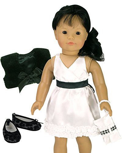-. Title : Dressy Doll Clothes, White Satin Dress with Black Sash Bow, Matching Clutch, Black Fur Cropped Sleeveless Jacket and Animal P.R.Int Flats, Complete Dressy 4 Pc Set by Sophia's®