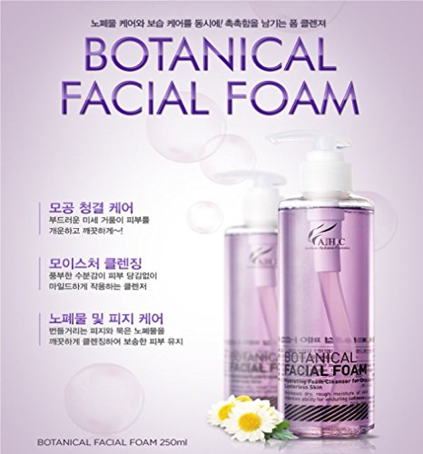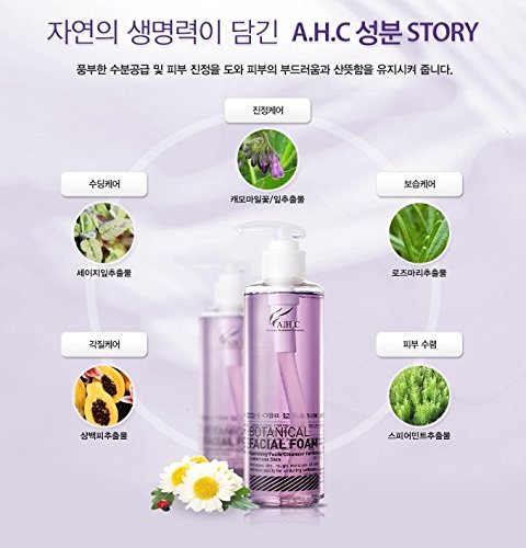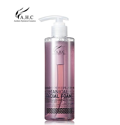 -. Feature : AHC Botanical Facial Foam 250ml (8.45 oz) / A secondary cleanser that helps removing makeup and waste residues of sensitive and dry skin from weakened skin moisture layer. Mild cleansing ingredients with soothing ingredients clean skin and help creating moisture layer, creating clean and moist skin. / This gentle cleanser makes fine lather that cleanses the impurities and dirt that are deep within your pores to refresh and clear up your skin without over-drying. / Cleanses shining sebum and old impurities to remain matt skin. / Major Ingredients : Allantoin, Aloe Extract, Glycyrrhiza Extract, Fennel Oil, Juiper Berry Oil