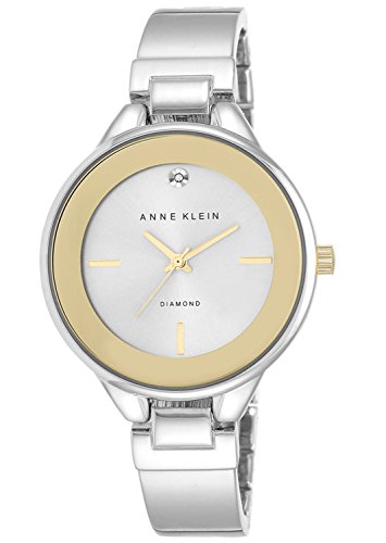-. Feature : Silver-tone metal alloy bracelet / Round case, 36mm / Silver-tone dial with gold-tone ring, diamond accent at twelve o'clock, stick indices, three hands and Anne Klein logo / Quartz movement / Not water resistant