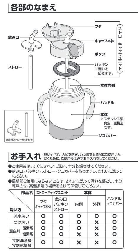 | 素材・材質 | 内びん:ステンレス鋼 胴部:ステンレス鋼(アクリル樹脂塗装) フタ・キャップ本体・ハンドル:ポリプロピレン 飲み口・ストロー・パッキン・ソコカバー:シリコーン |