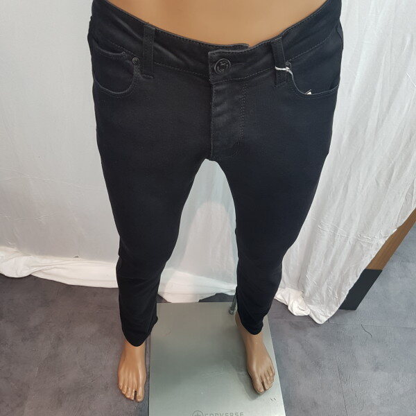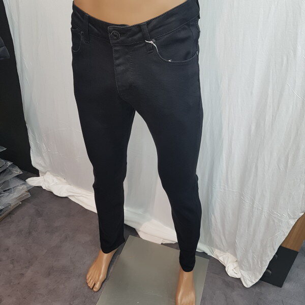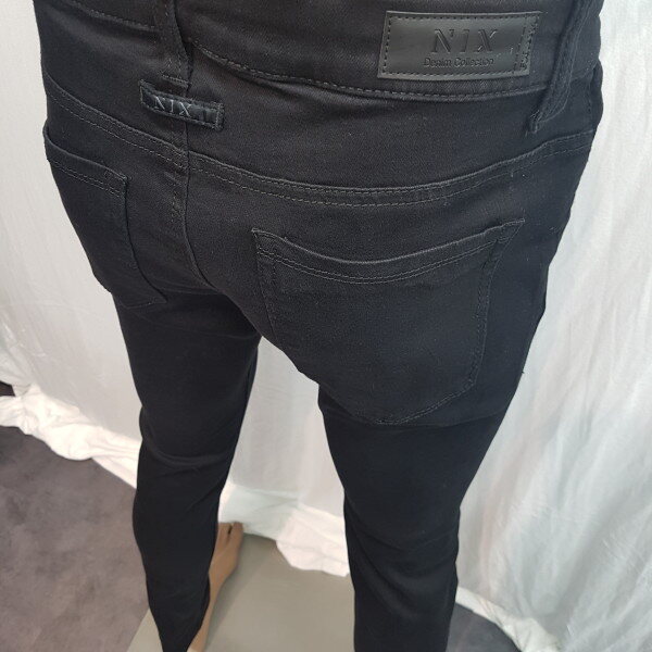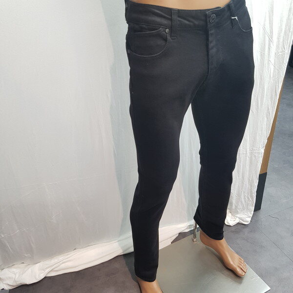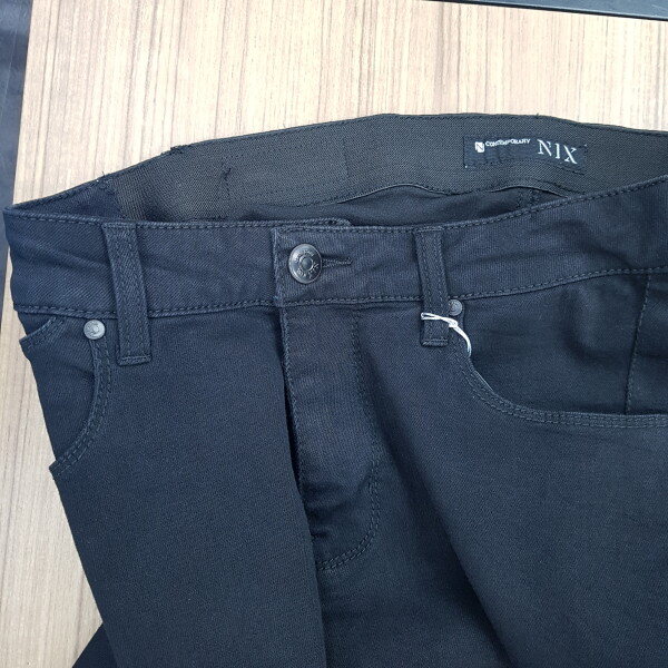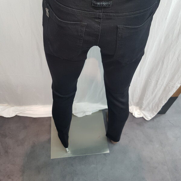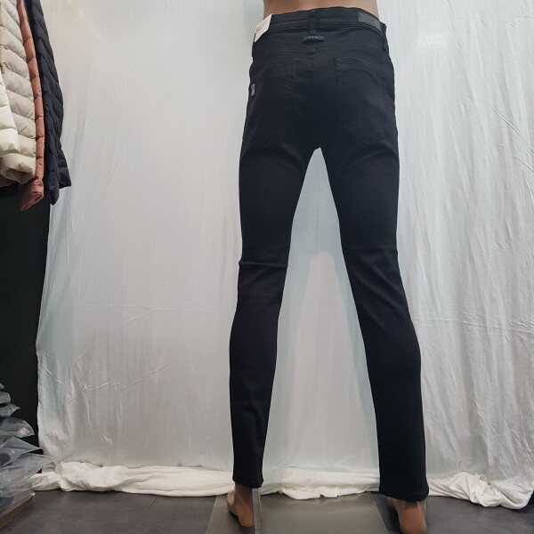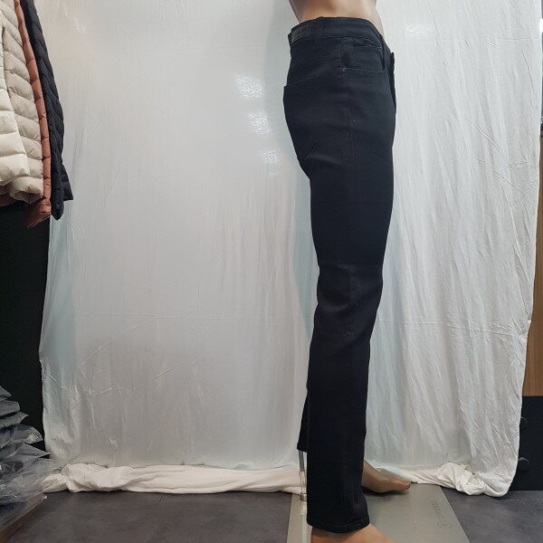 2018년 신상입니다. 기본 컬러,기본 디자인의 블랙 데님으로 뒤허리 안쪽에 밴딩처리가 되어있어 착용감이 편한 제품입니다.