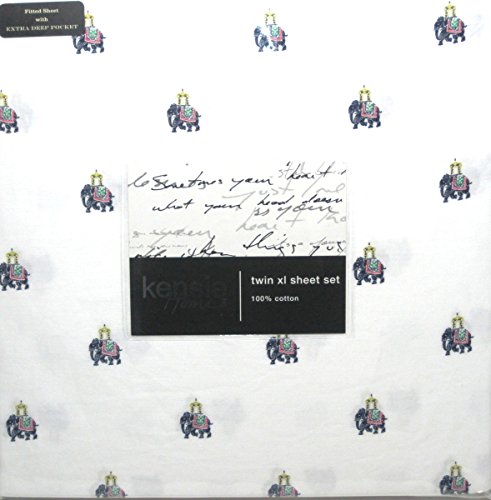 -. Brand : kensie -. Color : White ,navy,yellow,green,red -. EAN : 0728044447147 -. Feature : one twin flat sheet / one extra deep fitted sheet to fit mattresses up to 15" / One standard pillowcase / 100% Cotton / Machin washable -. Label : Kensie Home -. Manufacturer : Kensie Home -. ProductGroup : Home -. ProductTypeName : HOME_BED_AND_BATH -. Publisher : Kensie Home -. Size : twin size -. Studio : Kensie Home -. Title : Kensie Home 100% Cotton 3pcs TWIN XL Sheet Set Elephant Pattern -. UPC : 728044447147