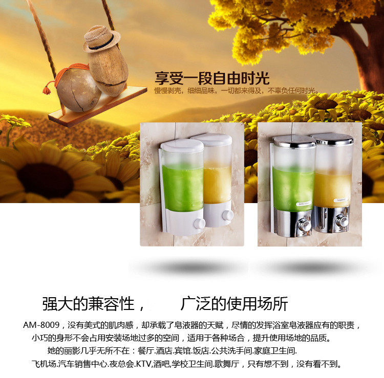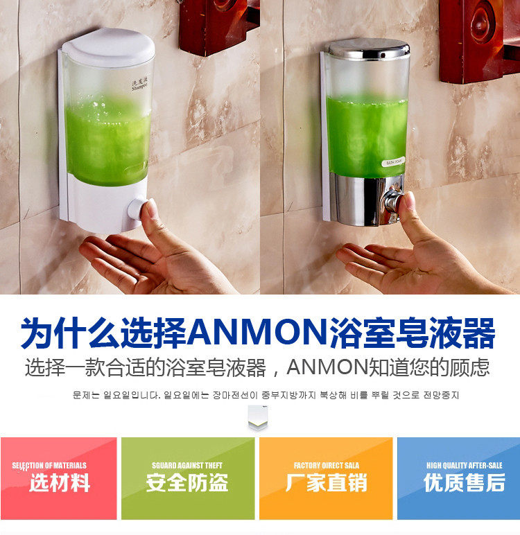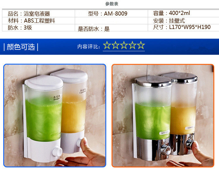 产品参数:Product parameters:体积(ml): 800Volume (ML): 800品牌: AnmonBrand: Anmon型号: AM-8088Model: AM-8088材质: 塑料Material: plastic表面工艺: 氧化Surface process: oxidation是否自动感应: 否Automatic induction: no安装方式: 壁挂式Installation: wall mounted