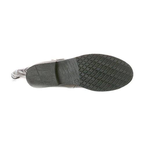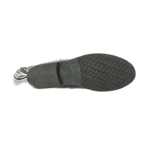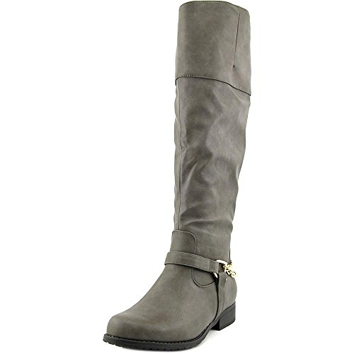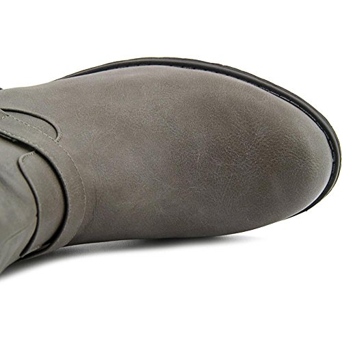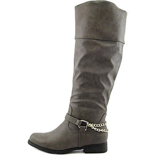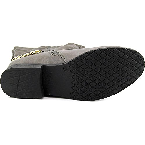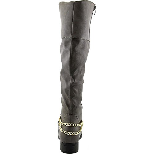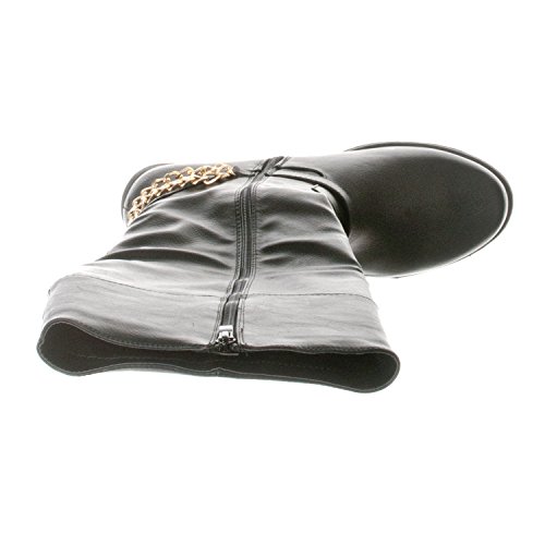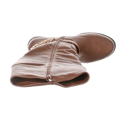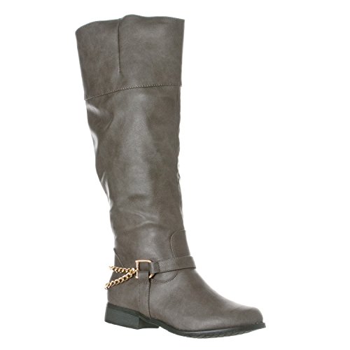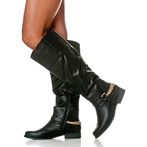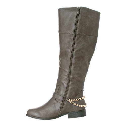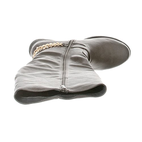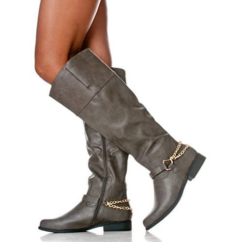 Product DescriptionClassic women's riding boot with fashionable front strap and chains. Available in 3 colors; black, brown and grey. Turn heads this season with these super cute, unique boots. Manmade materials. Zipper closure. Imported.0