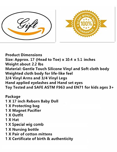 Yesteria reborn baby doll Toy Tested and SAFE ASTM F963 and EN71 for kids ages 3+.This doll is not only a toy for children, she or he is a fine collectable to be enjoyed by adult collectors. The doll fits into Newborn clothes and newborn sized disposable diapers.