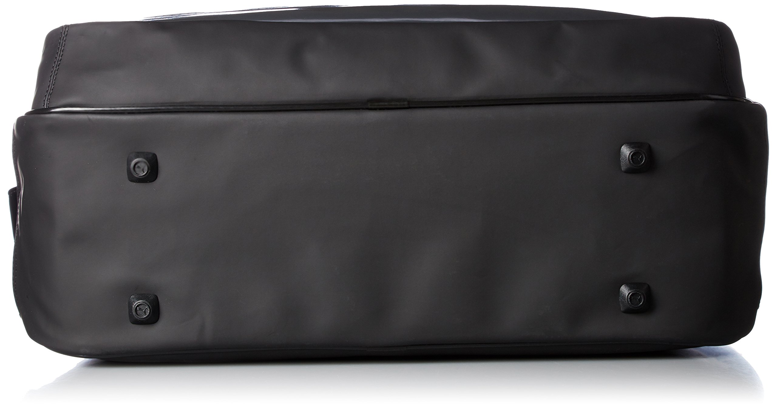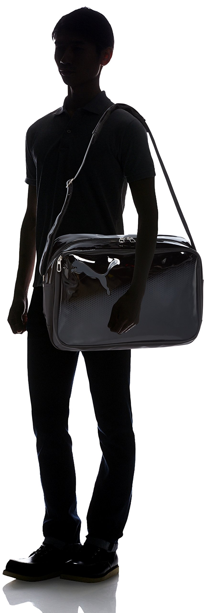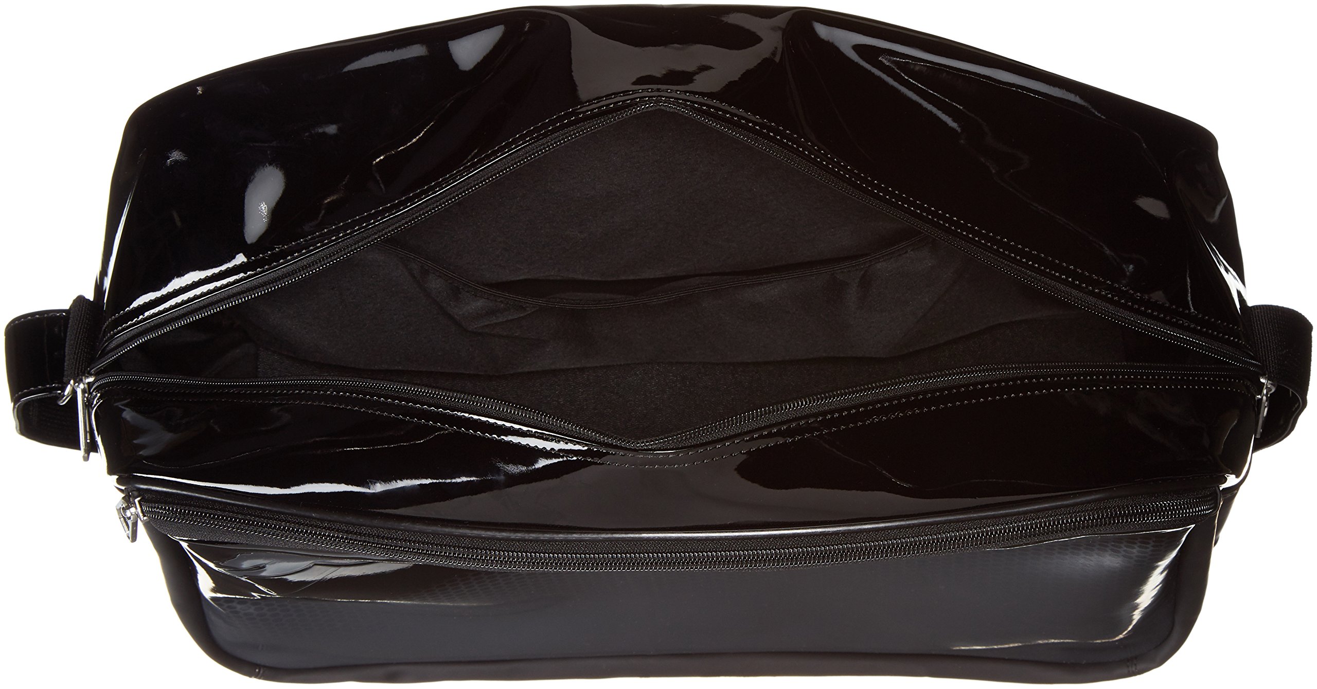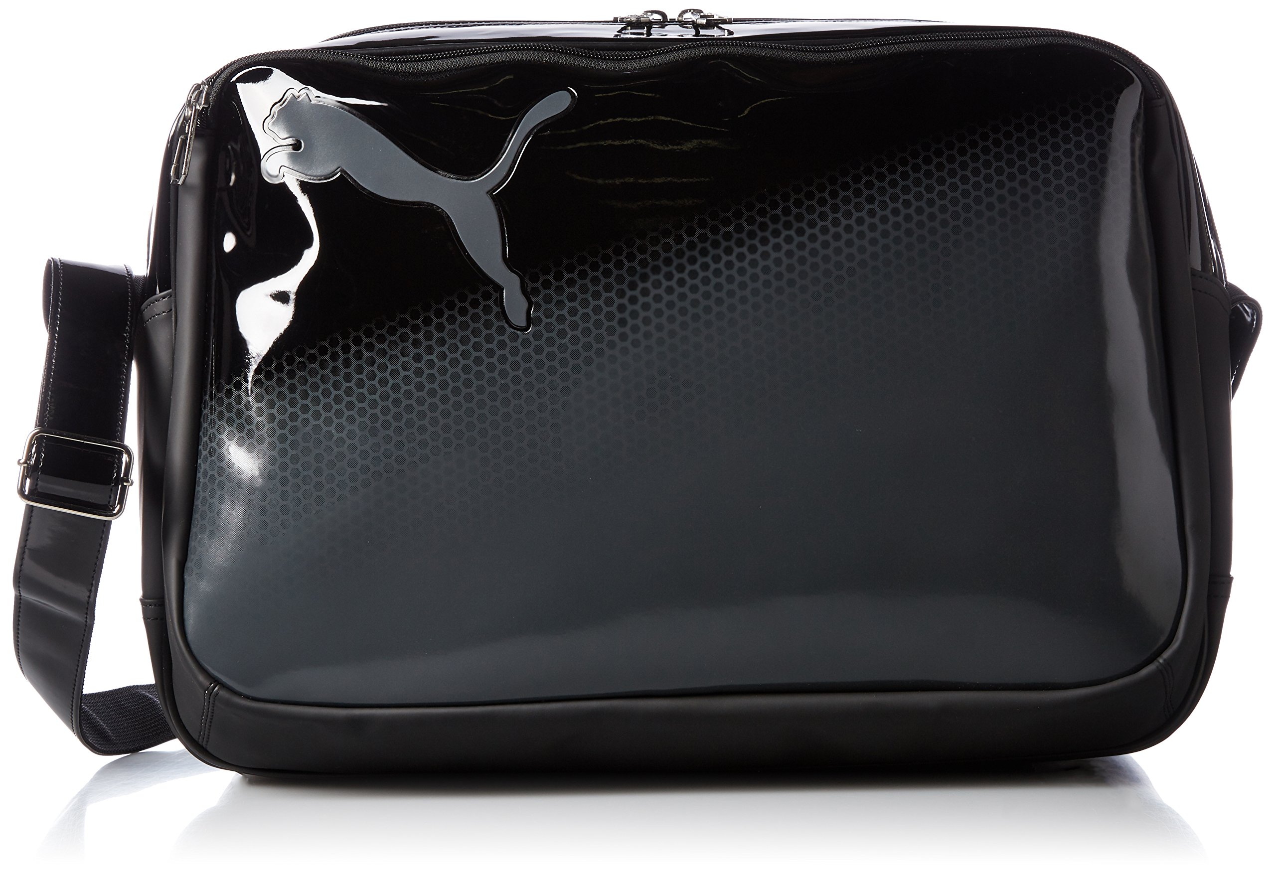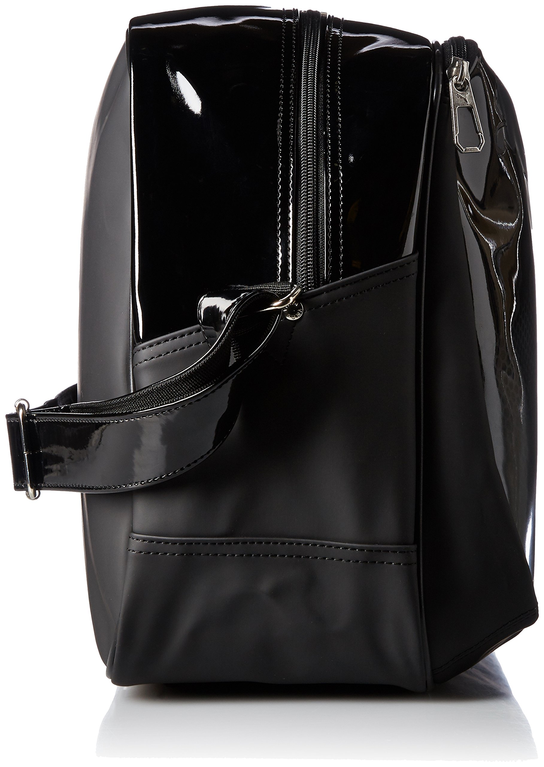 An enamel bag featuring a matte gradation print and a bold logo usage.