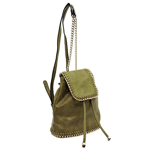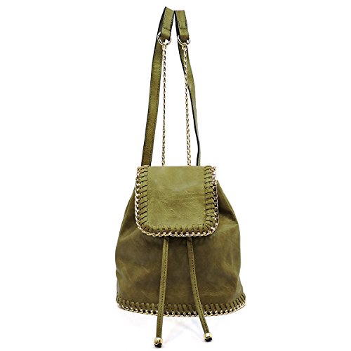 Synthetic leather with gold-tone chain trim. Adjustable backpack straps. Magnetic snap over drawstring closure. Lined inside compartment. Interior zip and pockets.