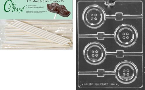 Cybrtrayd 45St25-B068 Button Lolly Baby Chocolate Candy Mold with 25 Cybrtrayd 4.5-Inch Lollipop Sticks