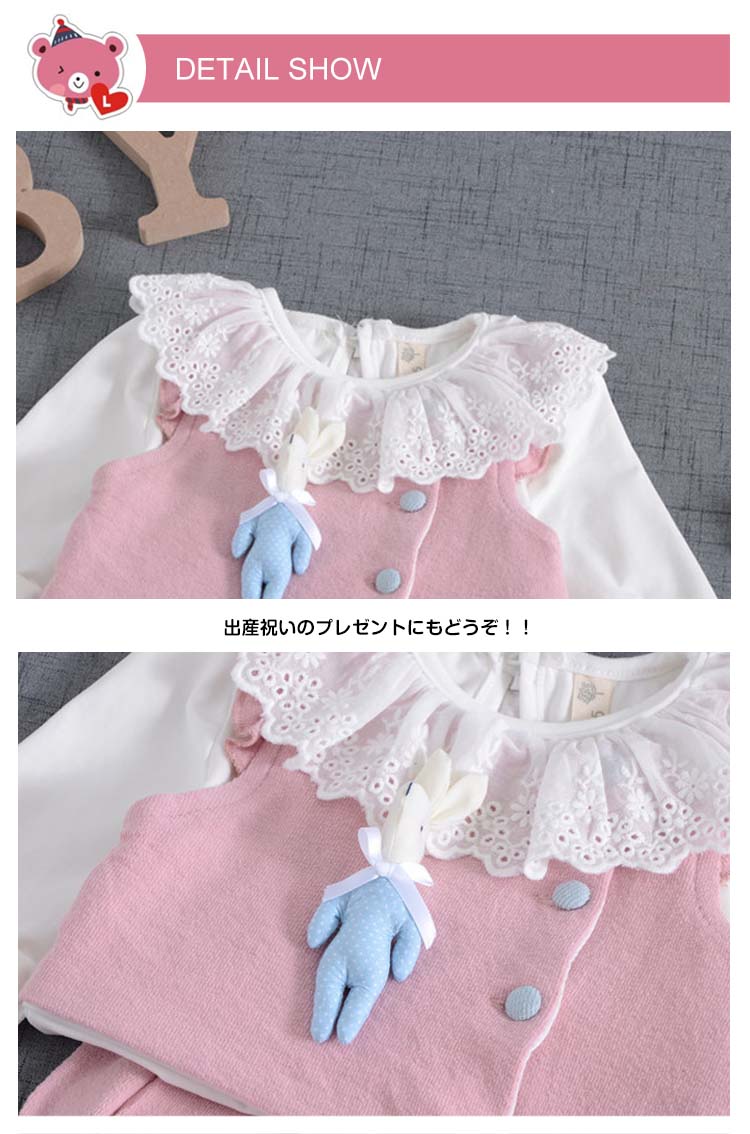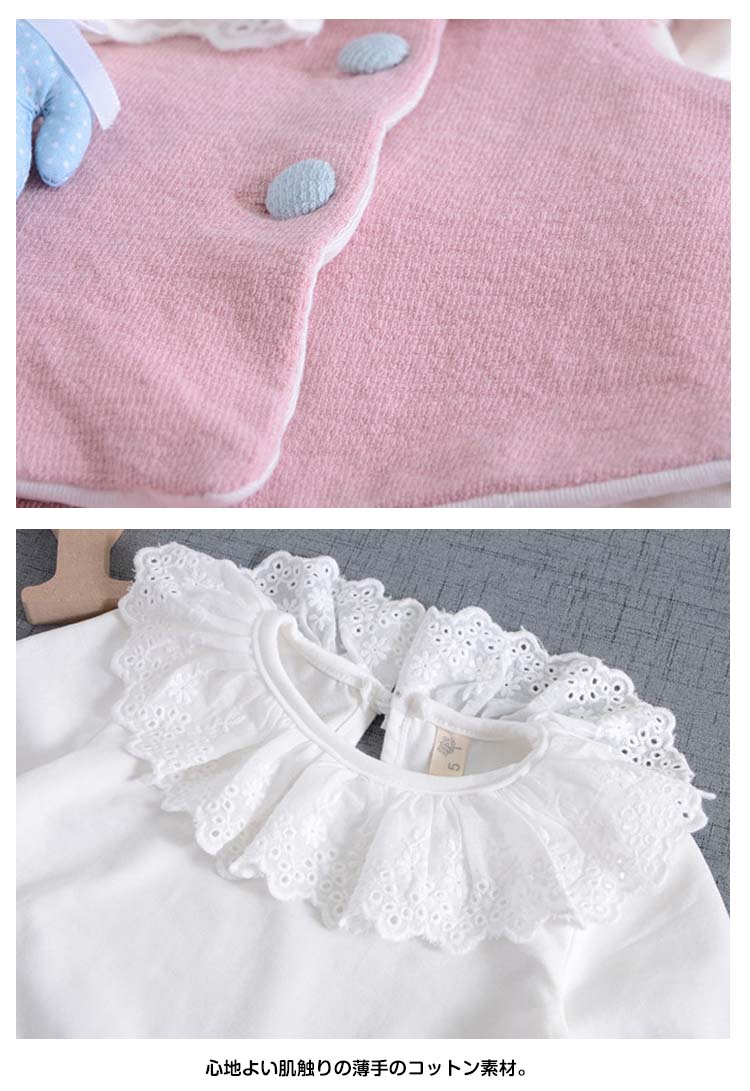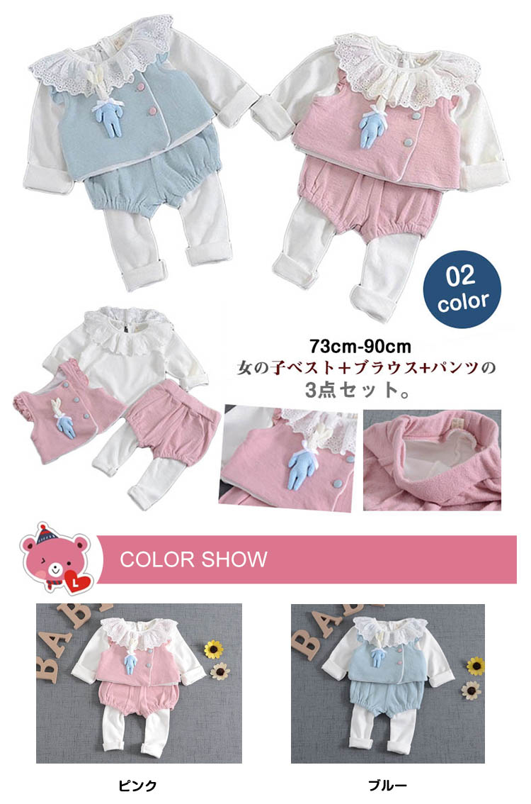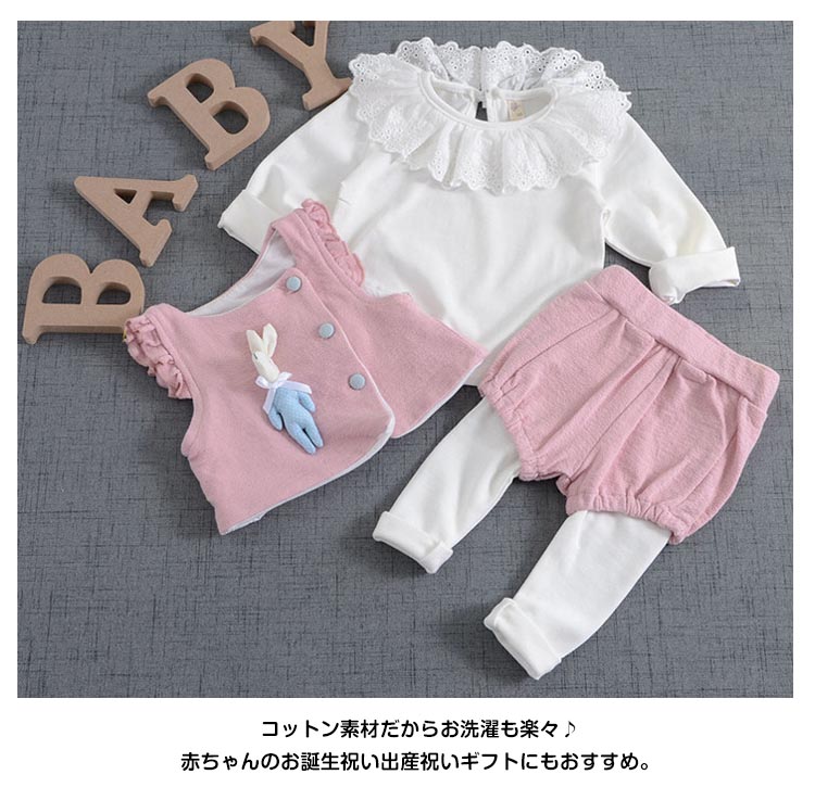 | 女の子ベスト+ブラウス+パンツの3点セット。 コットン素材だからお洗濯も楽々♪赤ちゃんのお誕生祝い出産祝いギフトにもおすすめ。 | |