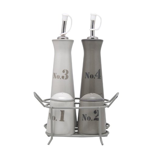 - Inspired by nature, the set includes 2 ceramic bottles, salt shaker and pepper shaker on a decorative metal stand