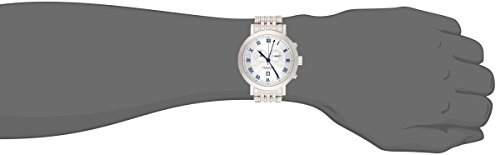 -. Feature : Silver-tone, embossed, inner dial surrounded by blue, Roman numeral, hour markers / Chronograph features include 60 second and 30 minute timer sub dials; date window at the 6 o'clock position / Silver-tone, stainless steel, bracelet / Swiss quartz movement / Water resistant to 330 feet (100 M): suitable for snorkeling, as well as swimming, but not diving