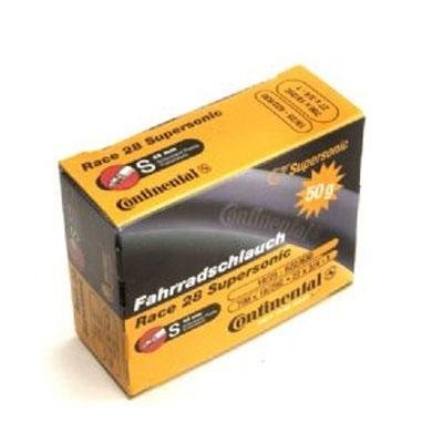 Studio : Continental Publisher : Continental Binding : Misc. Product Description With Supersonic you're in on the ultimate speed experience. Whether in races, time trials or marathons, the Supersonic product line for racing bikes and MTB gives you extra thrust. Every Supersonic product is uncompromisingly optimized as far as weight and rolling resistance are concerned. All components of the Supersonic tire and tube were individually reduced in volume and weight to what is absolutely necessary and technically feasible. This affects, for example, the thickness of the tire casing topping, material distribution of tread rubber, the thickness of the tread compound and the thickness of the tube walls. Of course, only highest-quality materials are used: highly refined polyamide for the carcasses, the famous ASC (activated silica compound) technology or the tried-and-tested Endless Edge tread pattern design. Radically optimizing a tire in terms of weight and rolling resistance means, of course, cutting back on other tire properties. In terms of mileage and puncture resistance, the Supersonic tires do not measure up to the proven quality of their corresponding all-around tires. Our engineers and chemists have turned out superlative technology here, ensuring Supersonic products a top position in racing and tuning. Hobby athletes can also benefit from our innovative capabilities, however, through Continentals various well-balanced alternatives that satisfy virtually the whole range of racing-tire demands. Weight: 50.0 g Super Light Weight! Lightest tubes on the Mark 0