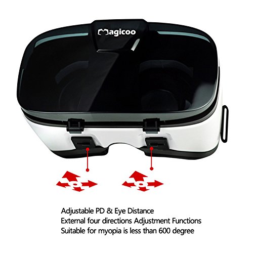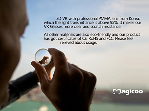 -. Feature : ★IMMERSIVE EXPERIENCE: Magicoo 3D VR Headset immediately transforms your Smartphone into a whole nother world. FOV105 degrees panoramic view and the screen is magnified 5.2 times than before, the super vision will give you unlimited world, an incredible visual fidelity and immersive feeling for 3D Movies and Games. / ★SUPER STRONG HEAT DISSIPATION ABILITY: Multi-layer thermolysis design effectly prevents smarts phone and face from being too heated, as well as prevents the glasses from being fogging. / ★WEARING COMFORTABLE FOR ADULTS AND KIDS: Adjust interpopillary distance by left and right movement and the T-shaped straps which also help decrease the pressure on around your eyes, you can get the most comfortable spot based on your own eyes distance. This is the perfect gift for your kids and child will receive .RIGHT? / ★LENS CONE ADJUSTMENT IS EASY FOR SHORTSIGHTEDNESS: Watch with naked eyes if you are below 600 degrees and you can wear glasses if you are more than 600 degrees. Adjust lens cone to get different focal length for different you. Clockwis rotate lens cone and obtain the clearest spot. / ★COMPATIBLE WITH ALMOST ALL PHONES: Magicoo 3D BOX fits for Apple and Android mobile phones such as: iPhone 6 iPhone 6S iPhone 6 Plus iPhone 6S Plus iPhone 5c, Samsung Galaxy S6 Edge, Samsung Note 4, Samsung Note 3, LG G3, Sony Xperia Z3 and other screen size is 4.5 to 6.5 inches smartphones.
