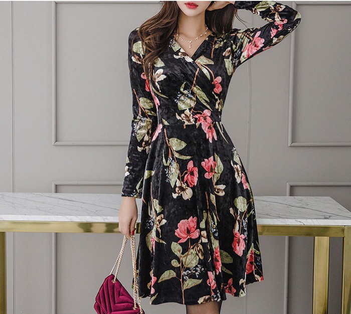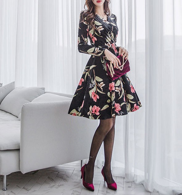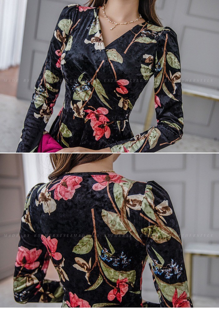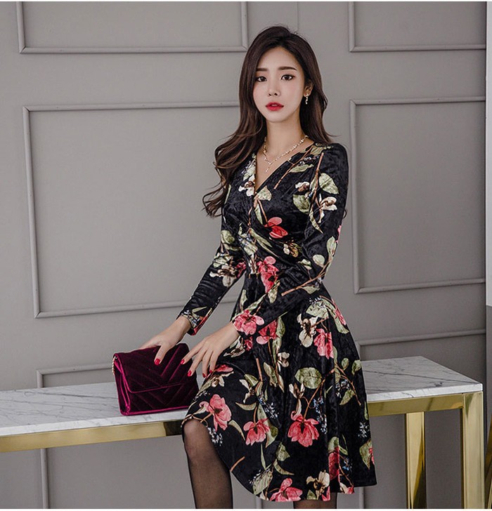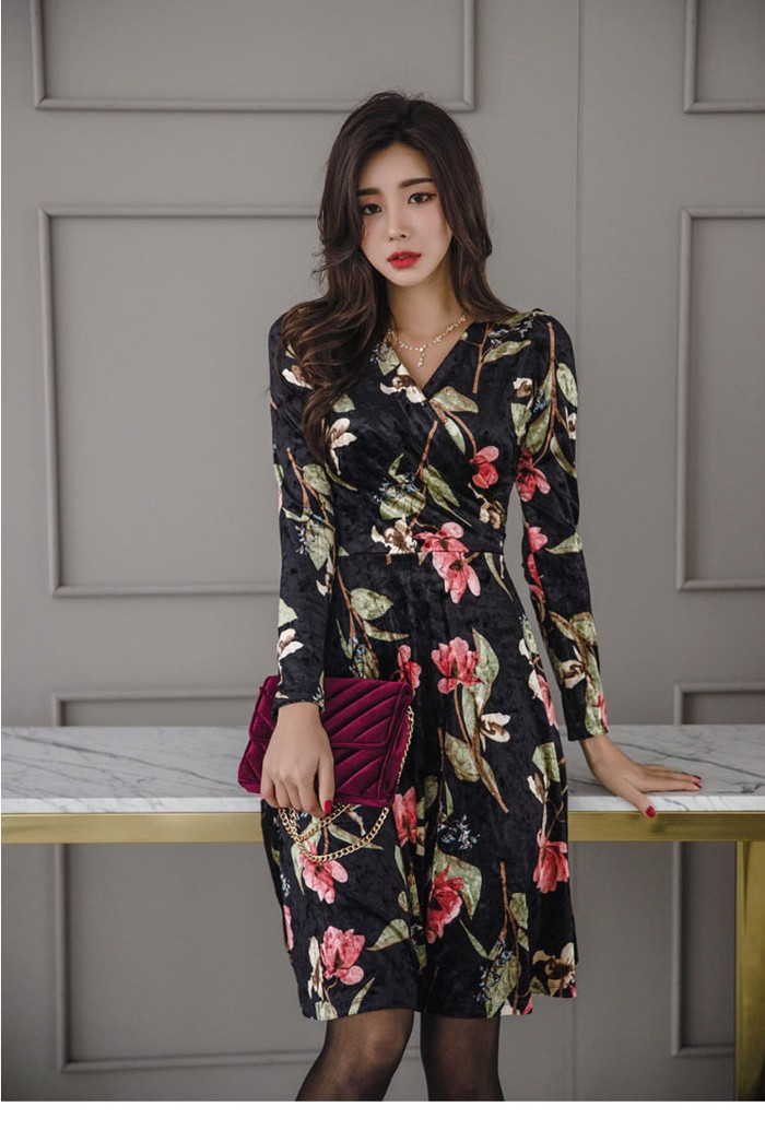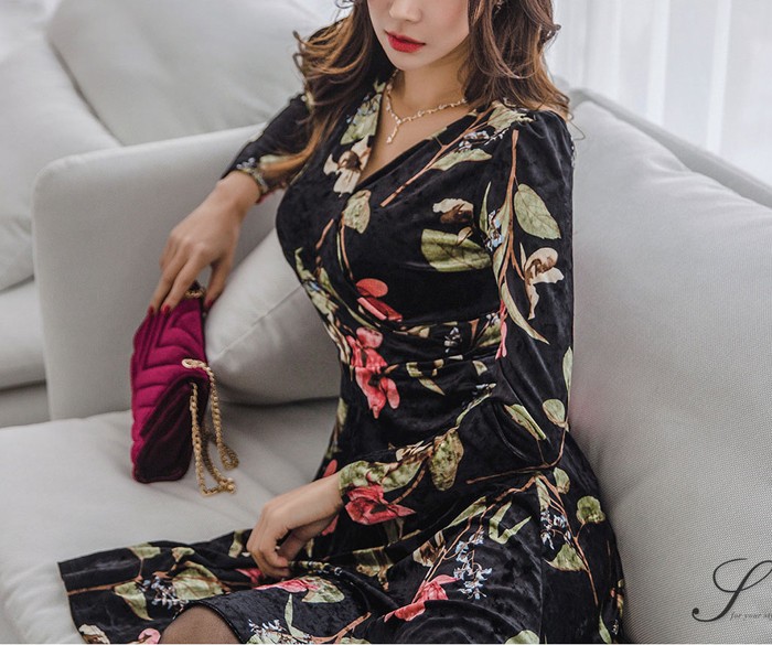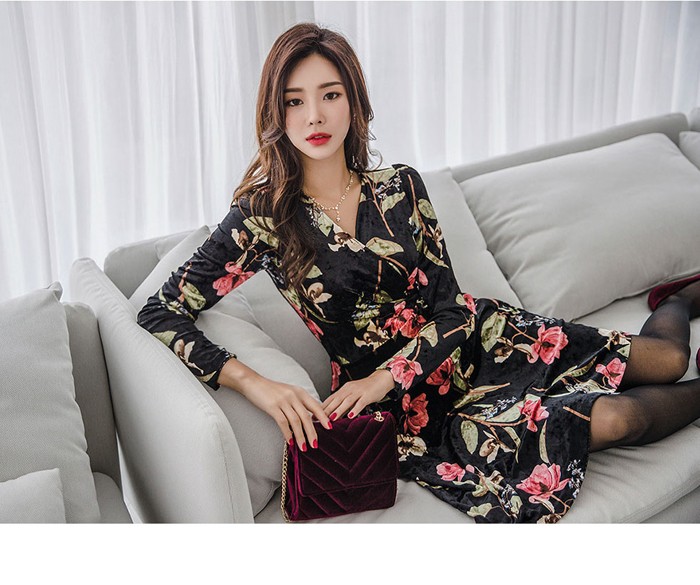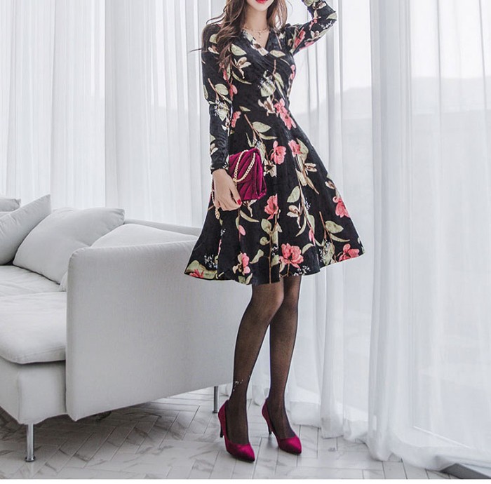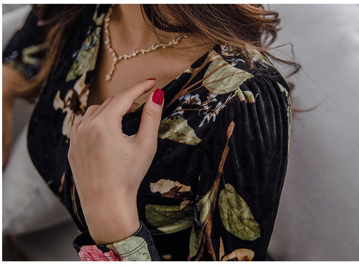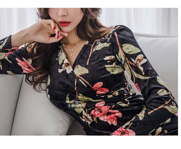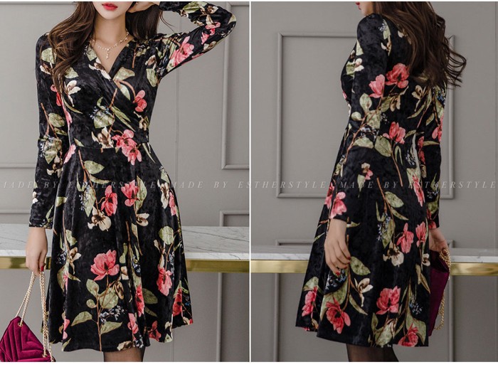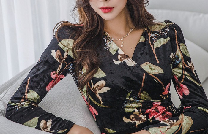 商品名:ワンピース カシュクール ベルベット ミニ丈 花柄 フラワー 長袖