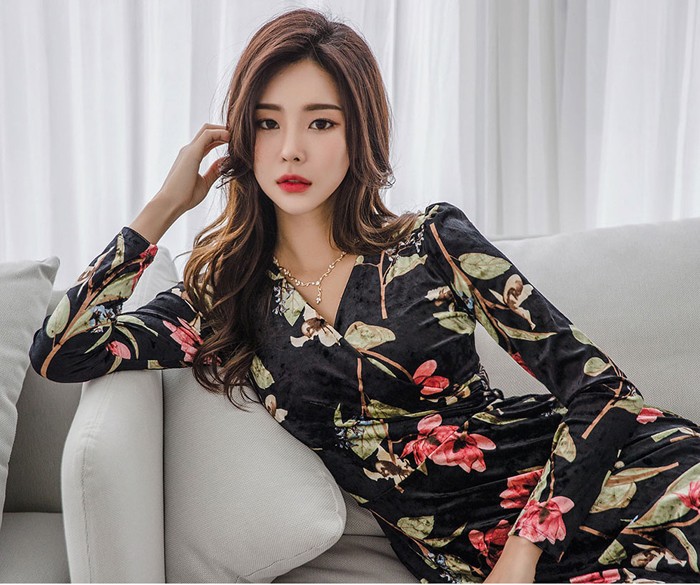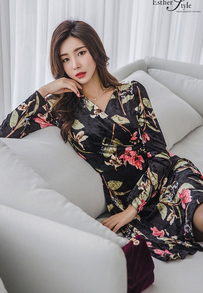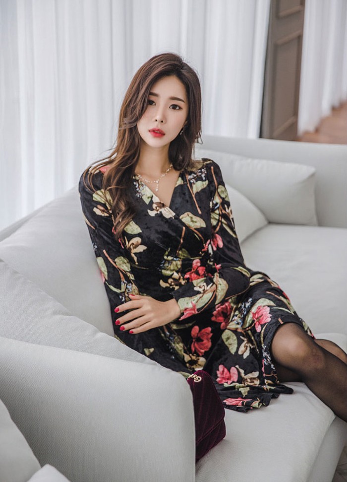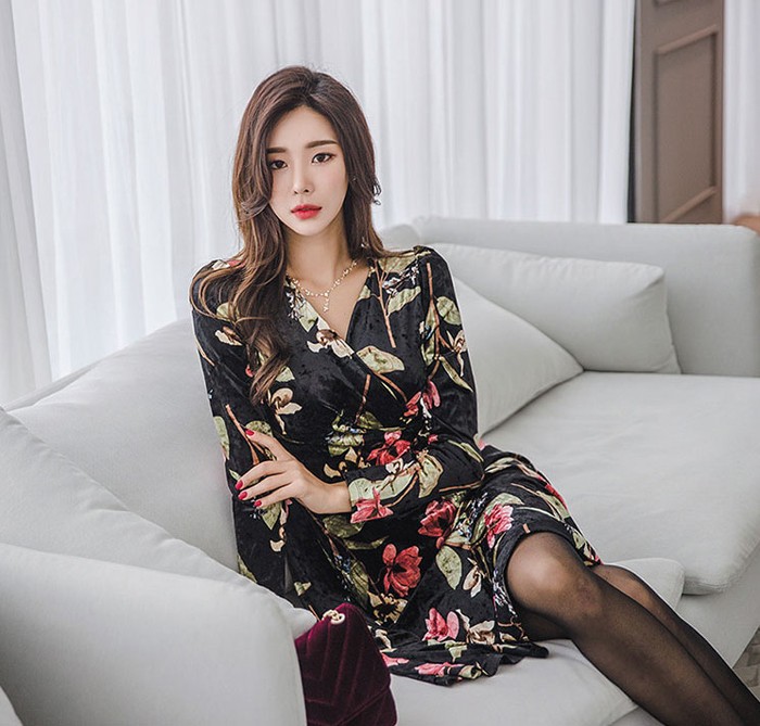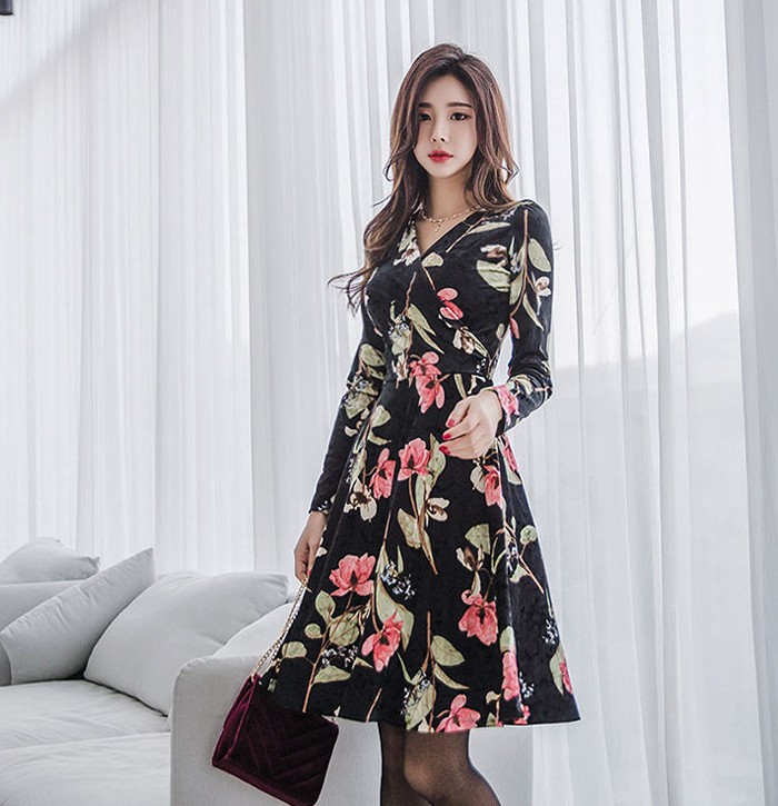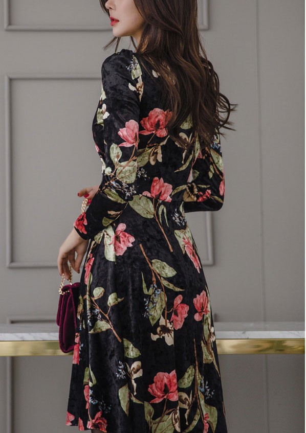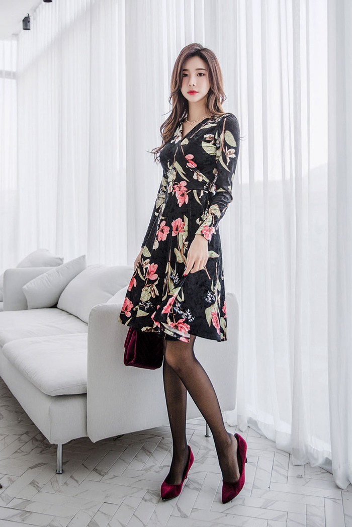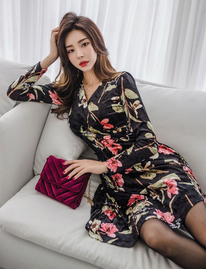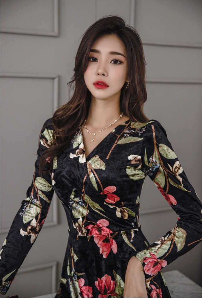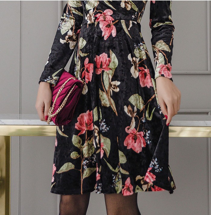 商品名:ワンピース カシュクール ベルベット ミニ丈 花柄 フラワー 長袖