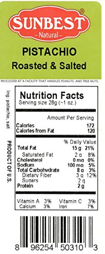 -. Feature : SUNBEST California Pistachios Roasted & Salted 3 lbs in Resealable Bag / Health Benefits: Great source of carbohydrates, proteins, fats, dietary fiber, phosphorus, potassium, thiamine / Rich in vitamins such as, vitamin E, vitamin A, and vitamin K / Great for snacking, topping, or baking / OK Kosher Certified