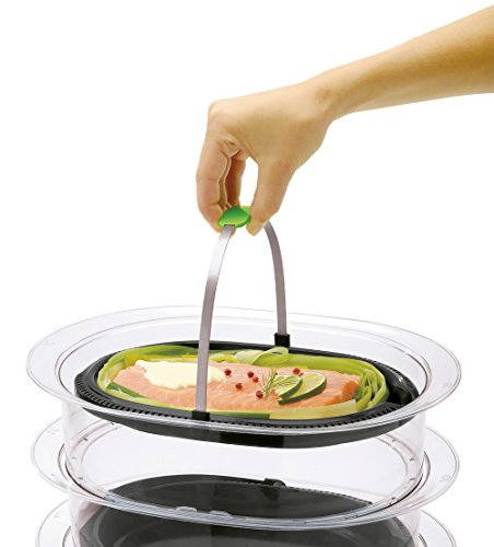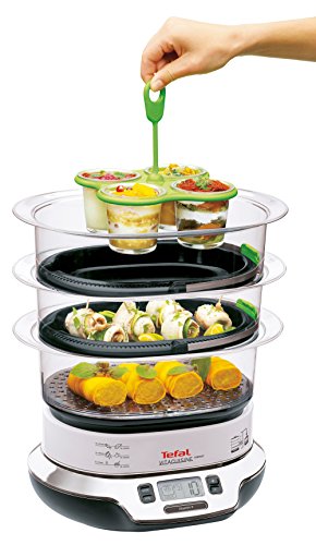 -. Feature : Drei getrennte Garbehälter / Automatische Warmhaltefunktion (60 Minuten) / Digitaler Timer mit programmierbarem Start / Leistung: 1.800 Watt; 2 der 3 Garbehälter mit geschlossener Garplatte / Lieferumfang: Tefal VS4003 Dampfgarer VitaCuisine Compact, 4 Glasbehälter mit Halterung, Bedienungsanleitung