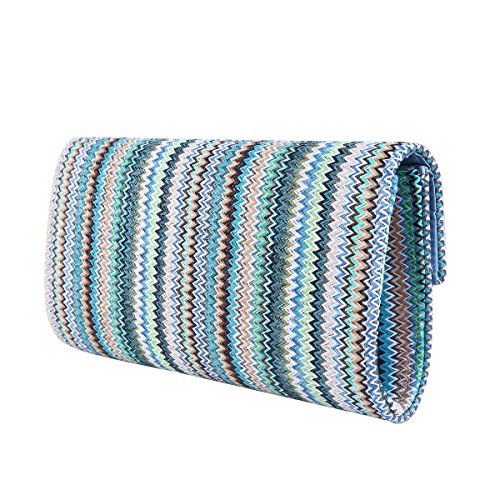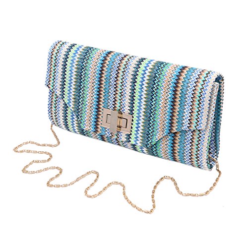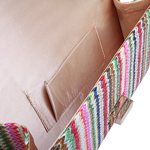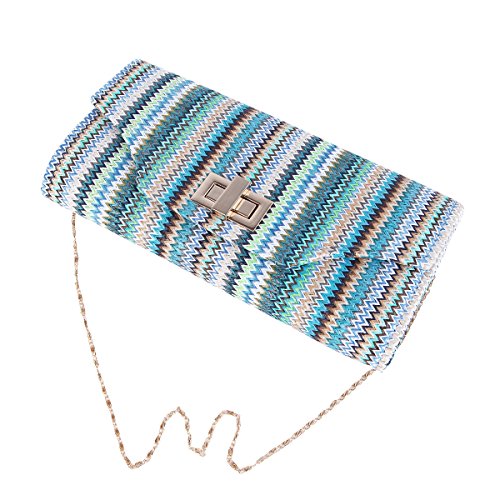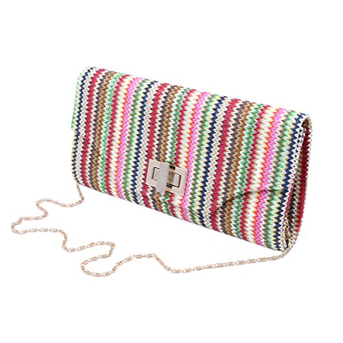 Product Description This premium quality clutch handbag is both elegant and stylish. Durable multi-color braided straw outer with classic chevron zig zag pattern, both chic and functional. Roomy enough to hold daily essentials. Fully lined with inner wall pocket and turnlock flap closure. Gold tone hardware. Removable hideaway shoulder chain strap with 21" drop. Unique and versatile. Perfect for both day and night use. Casual luxury at its best. A must have for all handbag lovers. The size is 11" (L) x 5.5" (H) x 2.5" (W). 0