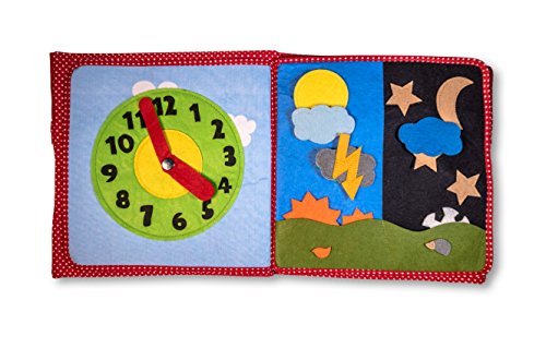 Our textile Quiet Book can teach your kids numbers, getting to know the clock, recognizing day and night, knowing different weather conditions, practicing fine motor skills, catching flies for a hungry frog, the four seasons, washing, hanging clothes, dressing up a dad and mum, using lace to help the bee find the right way to the hive, doing the girl's plait and the last page is all about learning how to lace the shoes.